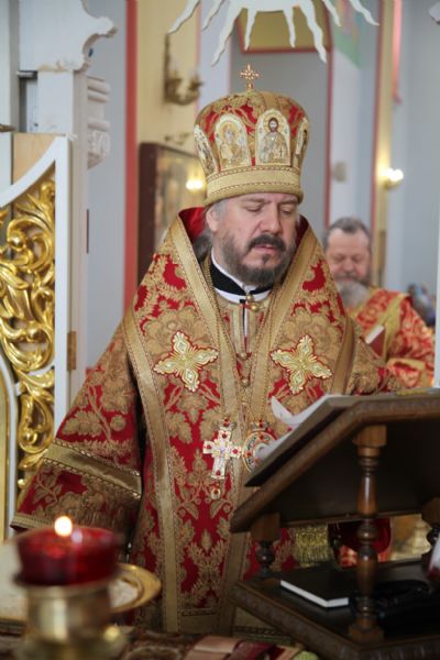 Его Преосвященству сослужили: иерей Георгий Москаленко; иерей Андрей Калнин, ризничий собора; иерей Виталий Шаркеев; иерей Андрей Попов; иеромонах Ермоген (Крещенко)
