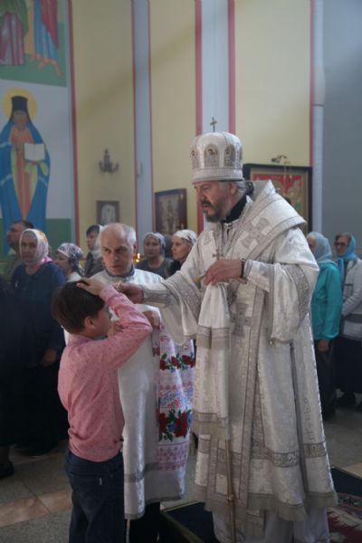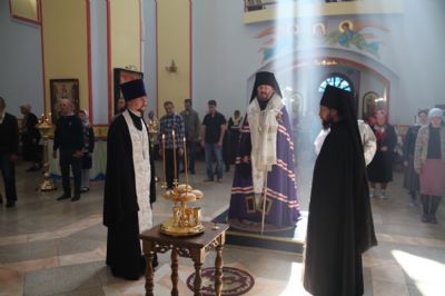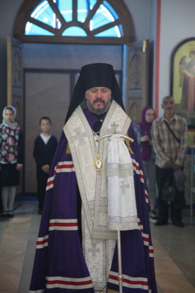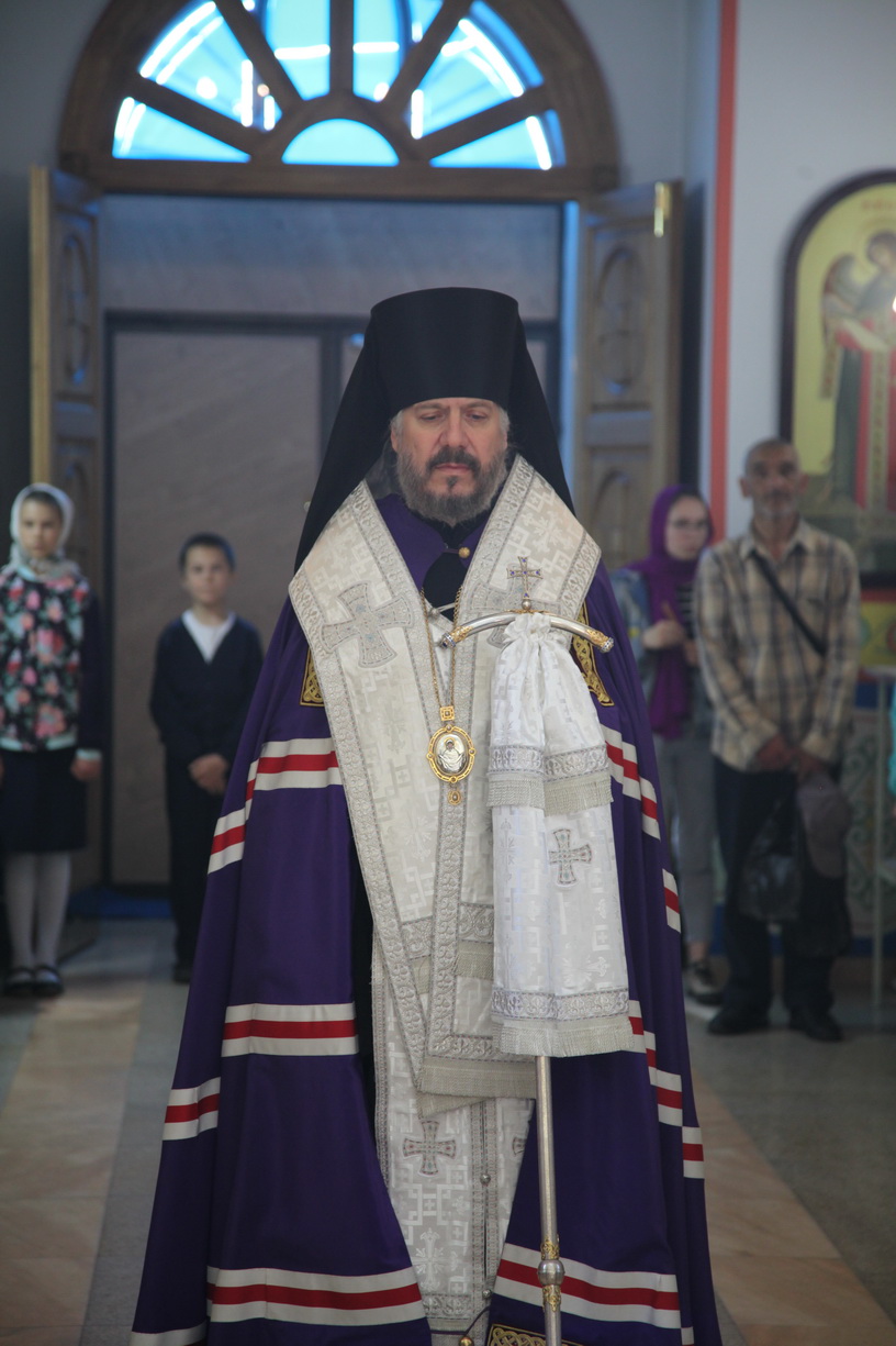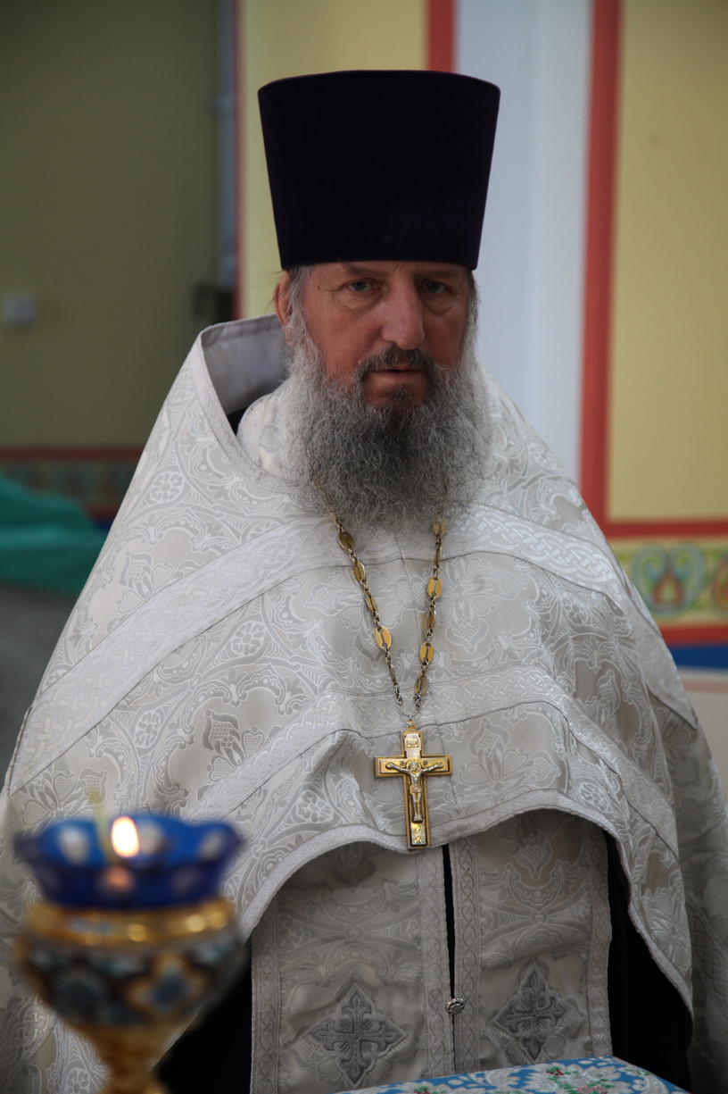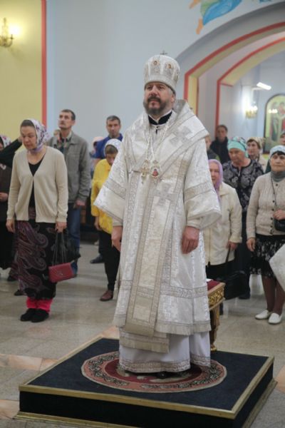 Его Преосвященству сослужили: иерей Георгий Москаленко руководитель Епархиального миссионерского отдела; иерей Виталий Шаркеев; иерей Андрей Попов; иеромонах Ермоген (Крещенко).