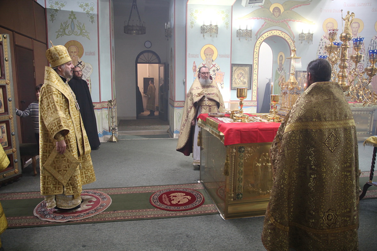 Его Преосвященству сослужили: иерей Георгий Москаленко; иерей Андрей Калнин; иерей Виталий Шаркеев; иеромонах Ермоген (Крещенко).