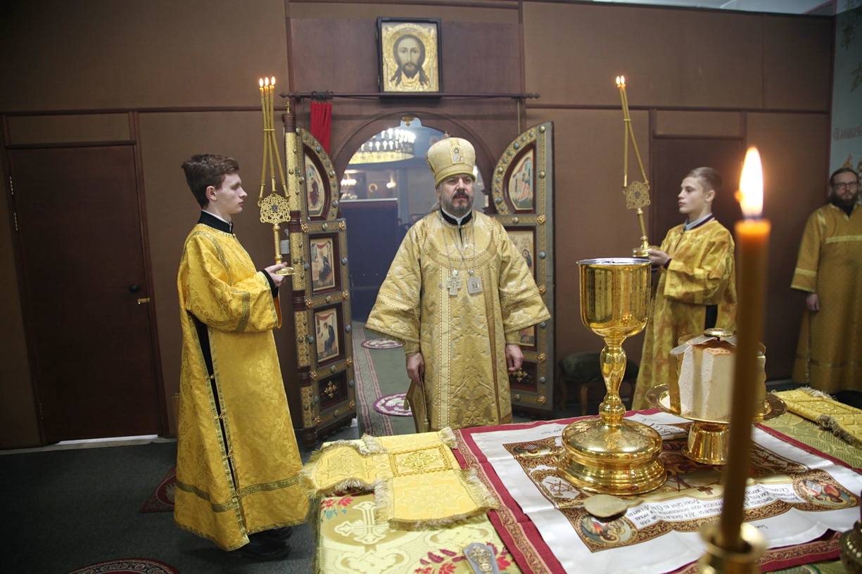 Его Преосвященству сослужили: иерей Георгий Москаленко; иерей Андрей Калнин; иерей Виталий Шаркеев; иеромонах Ермоген (Крещенко).