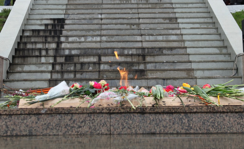 На сугубой ектении были вознесены особые прошения из чинопоследования благодарственного молебна на 9 мая. В частности, в этой молитве содержится обращение к Богу с просьбой помочь на все времена твердо хранить память о трагических событиях времен войны и славном Дне Победы.