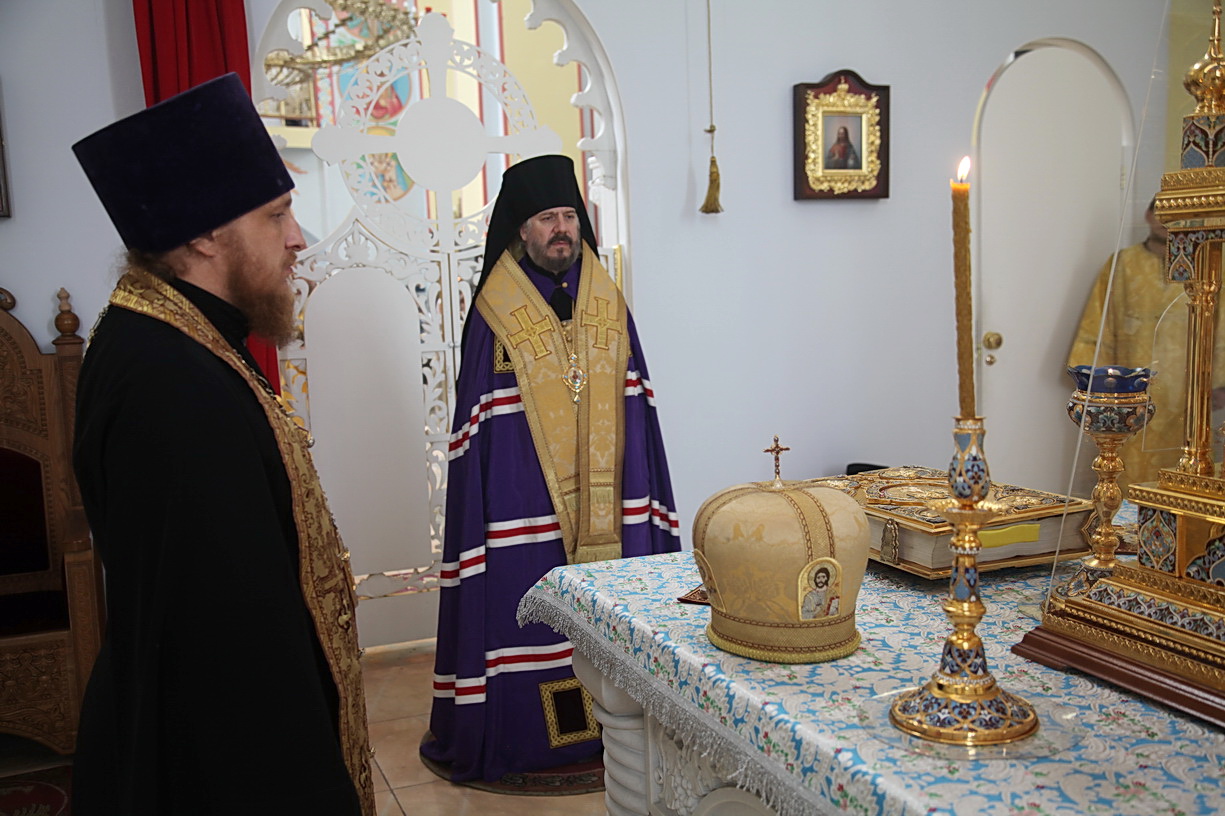 Его Преосвященству сослужили: иерей Георгий Москаленко, иерей Андрей Калнин; иерей Виталий Шаркеев; иерей Андрей Попов, иеромонах Ермоген (Крещенко).
