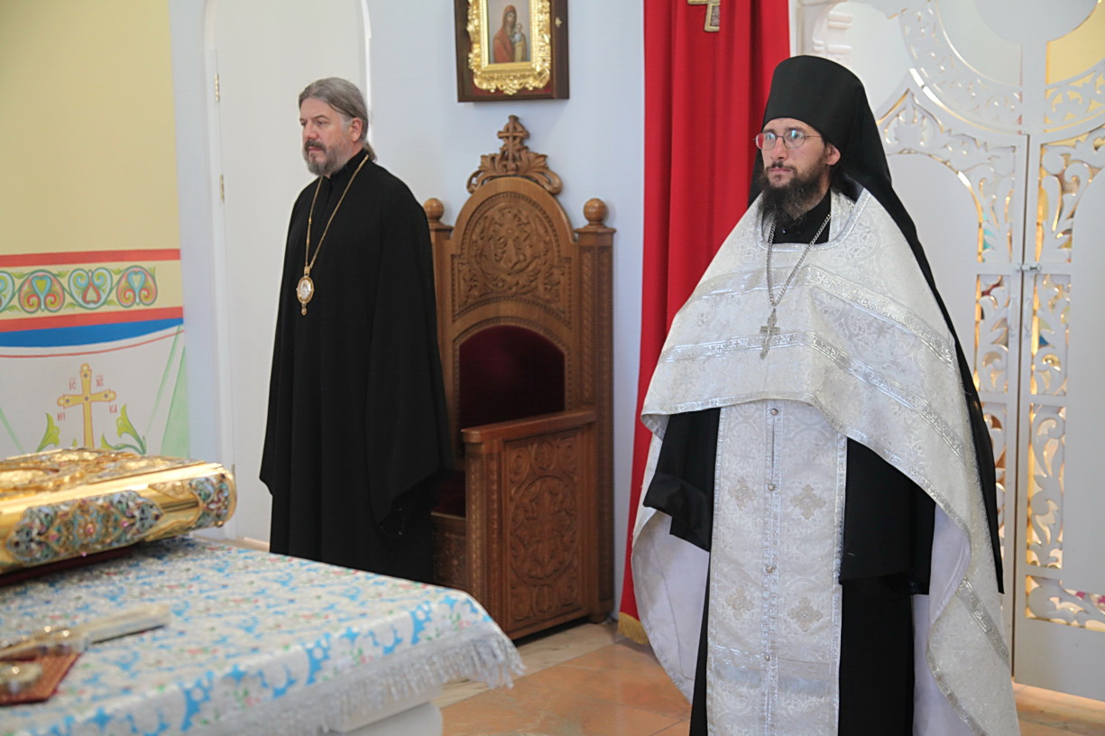 Его Преосвященству сослужили: иерей Георгий Москаленко; иерей Андрей Калнин; иерей Виталий Шаркеев; иерей Андрей Попов; иеромонах Ермоген (Крещенко).