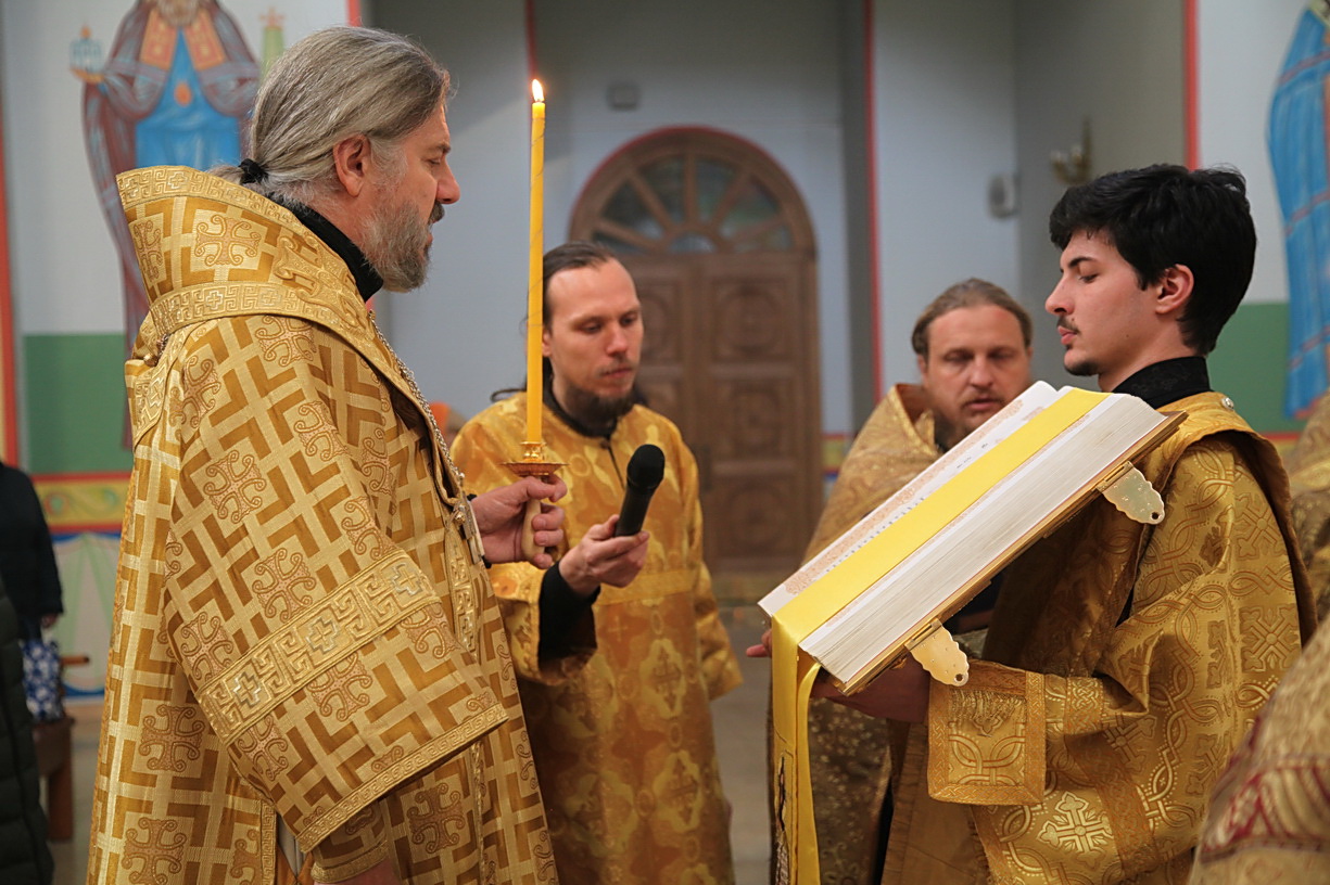 Его Преосвященству сослужили: иерей Георгий Москаленко; Андрей Калнин; иерей Виталий Шаркеев; иерей Андрей Попов; иеромонах Ермоген (Крещенко).