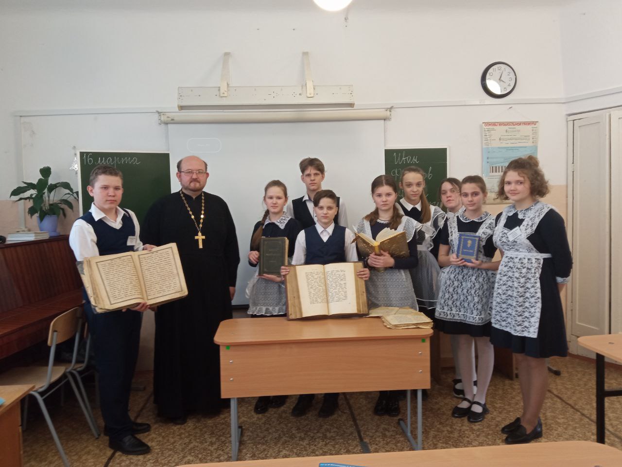 Отец Роман рассказал ученикам о первом русском книгопечатнике диаконе Иване Фёдорове и его вкладе в русскую культуру и книгопечатание. Дети узнали о первой напечатанной Библии – Острожской. Ребятам были представлены старинные фолианты богослужебных книг: «Псалтирь», «Апостол», «Минеи», жития святых.