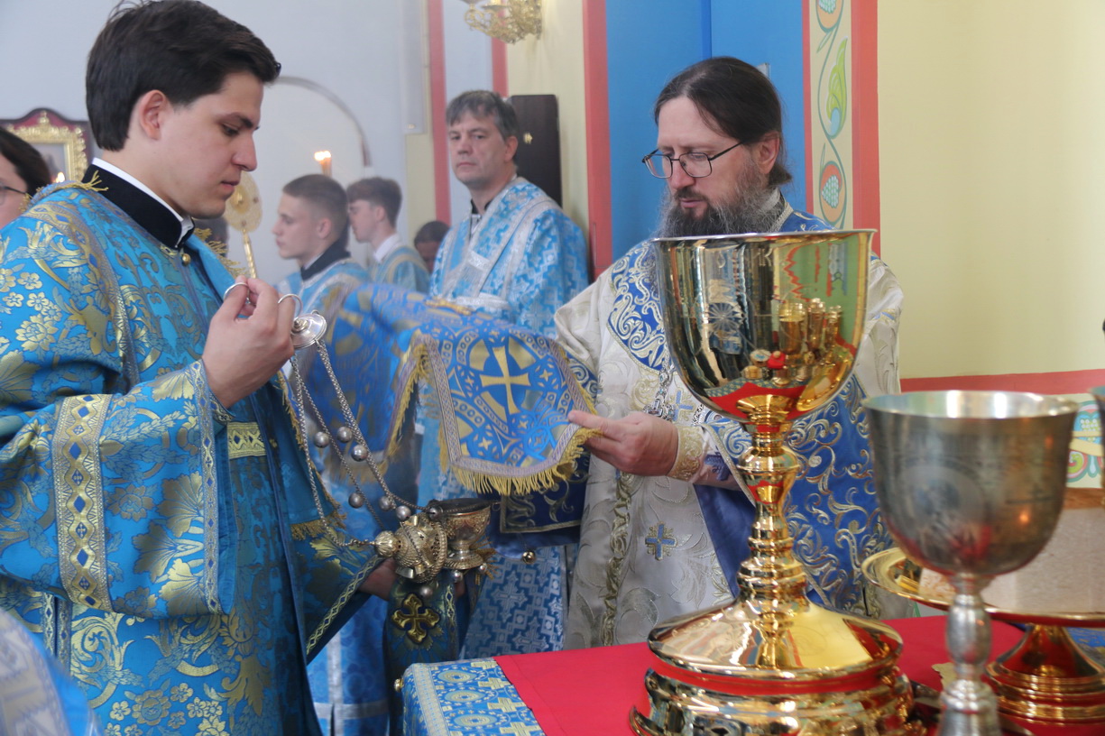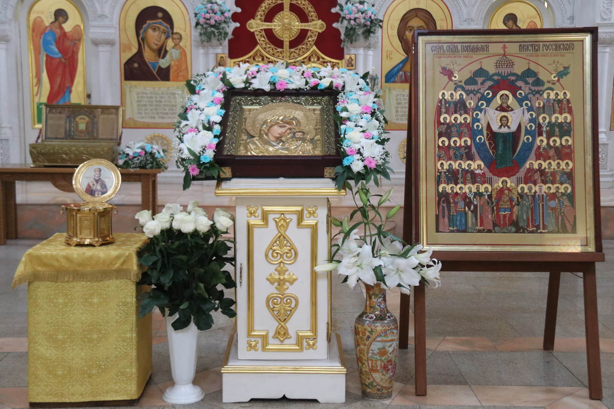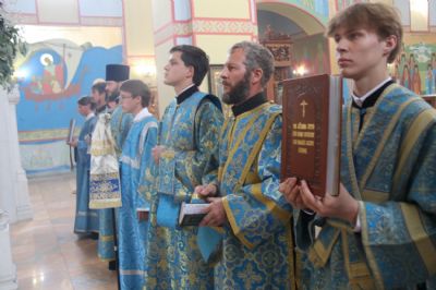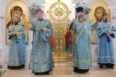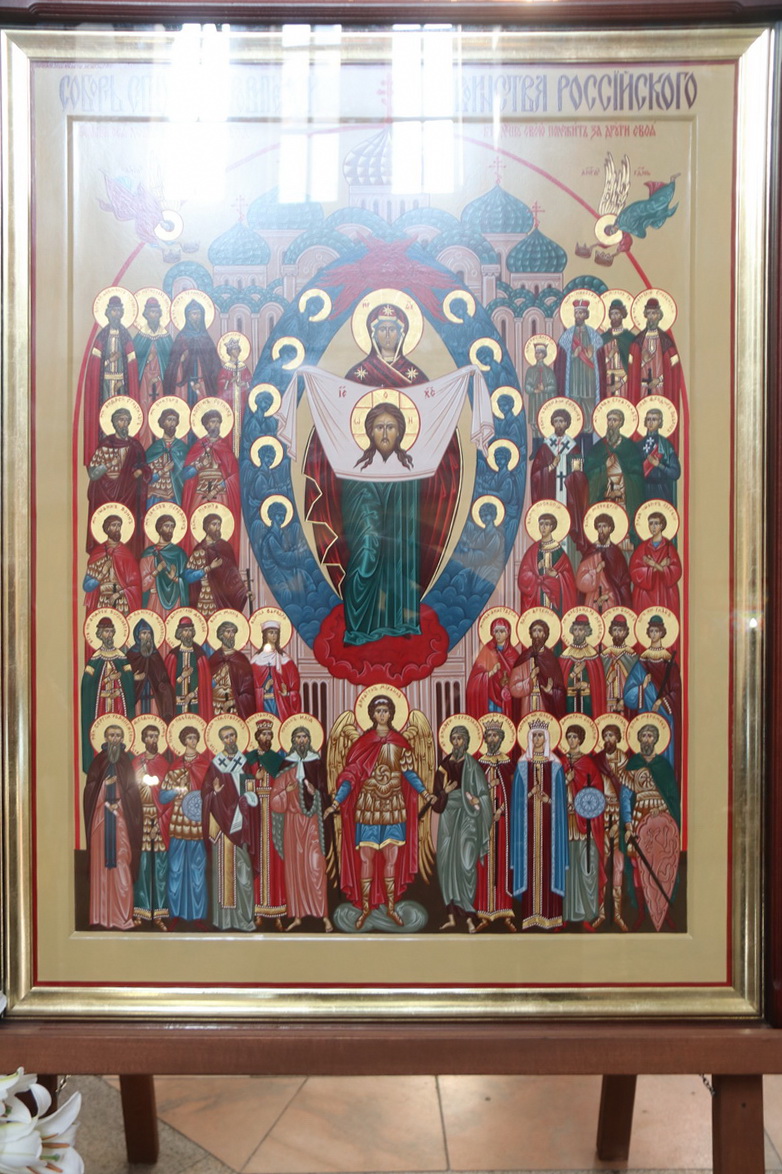 Литургия совершалась перед иконой «Собор святых покровителей воинства российского», прибывшей в храм накануне Крестным ходом из Арсеньевской епархии.