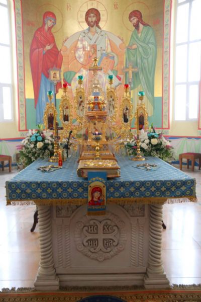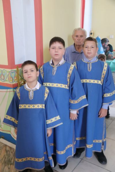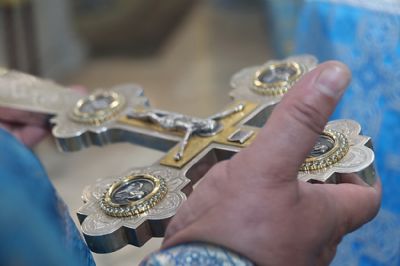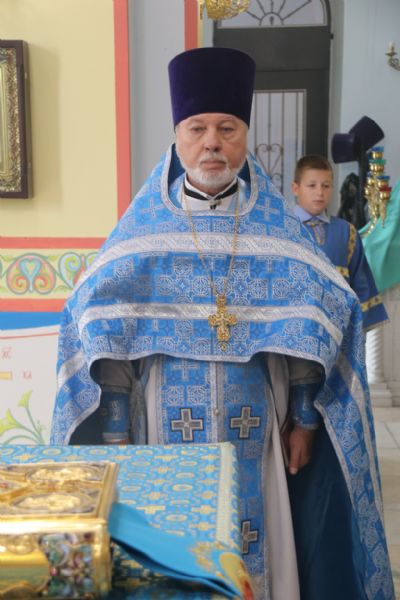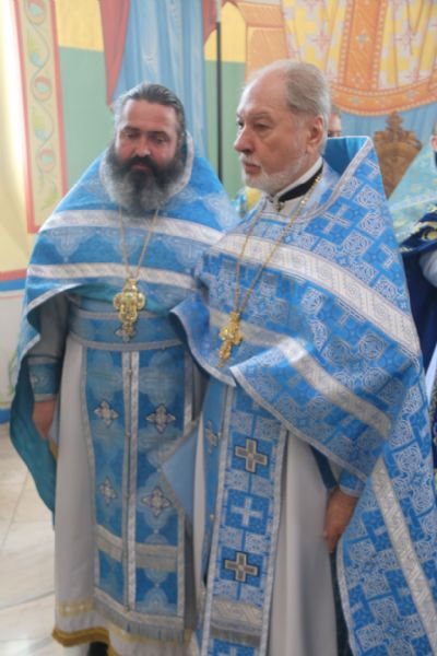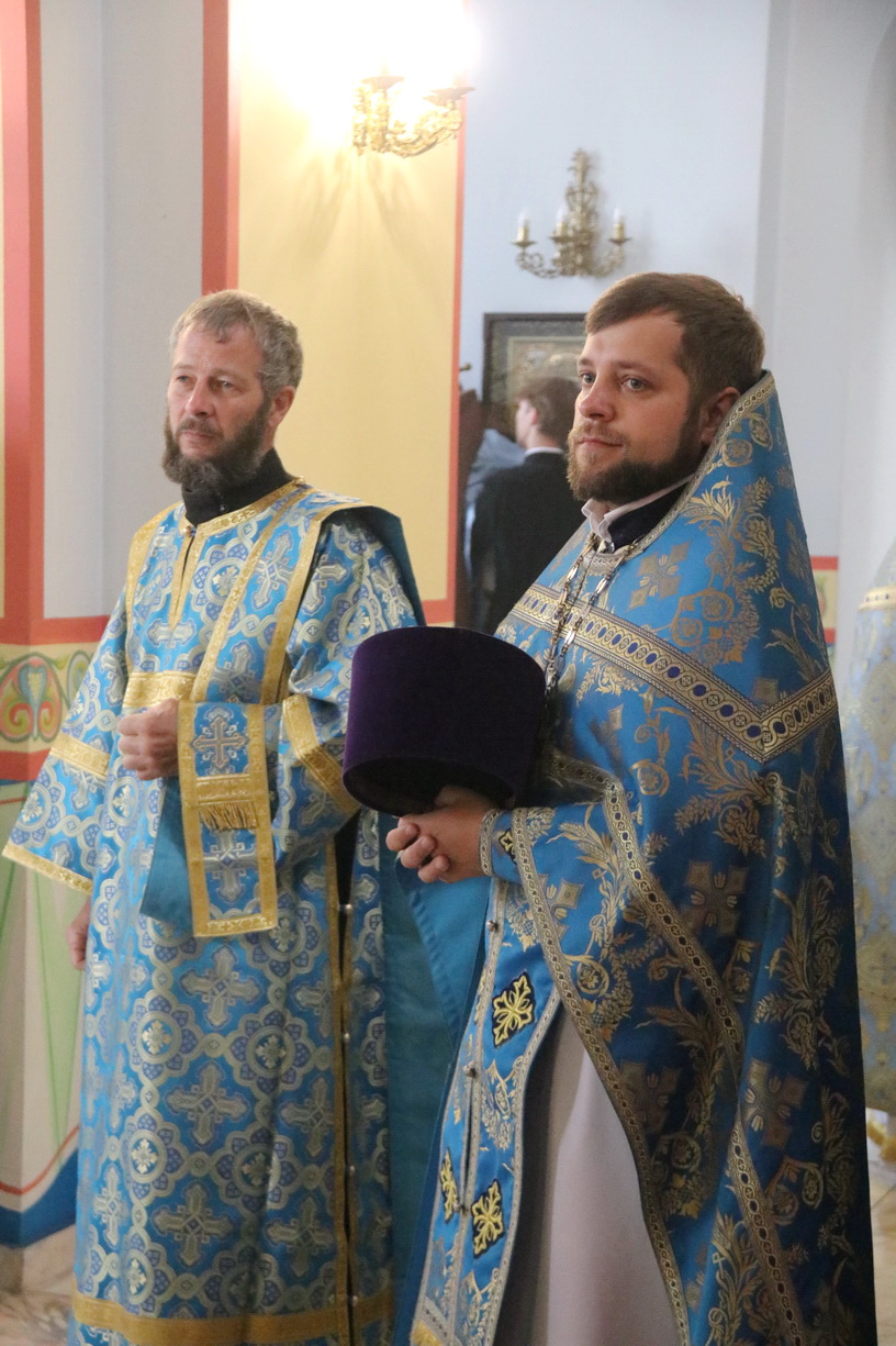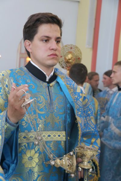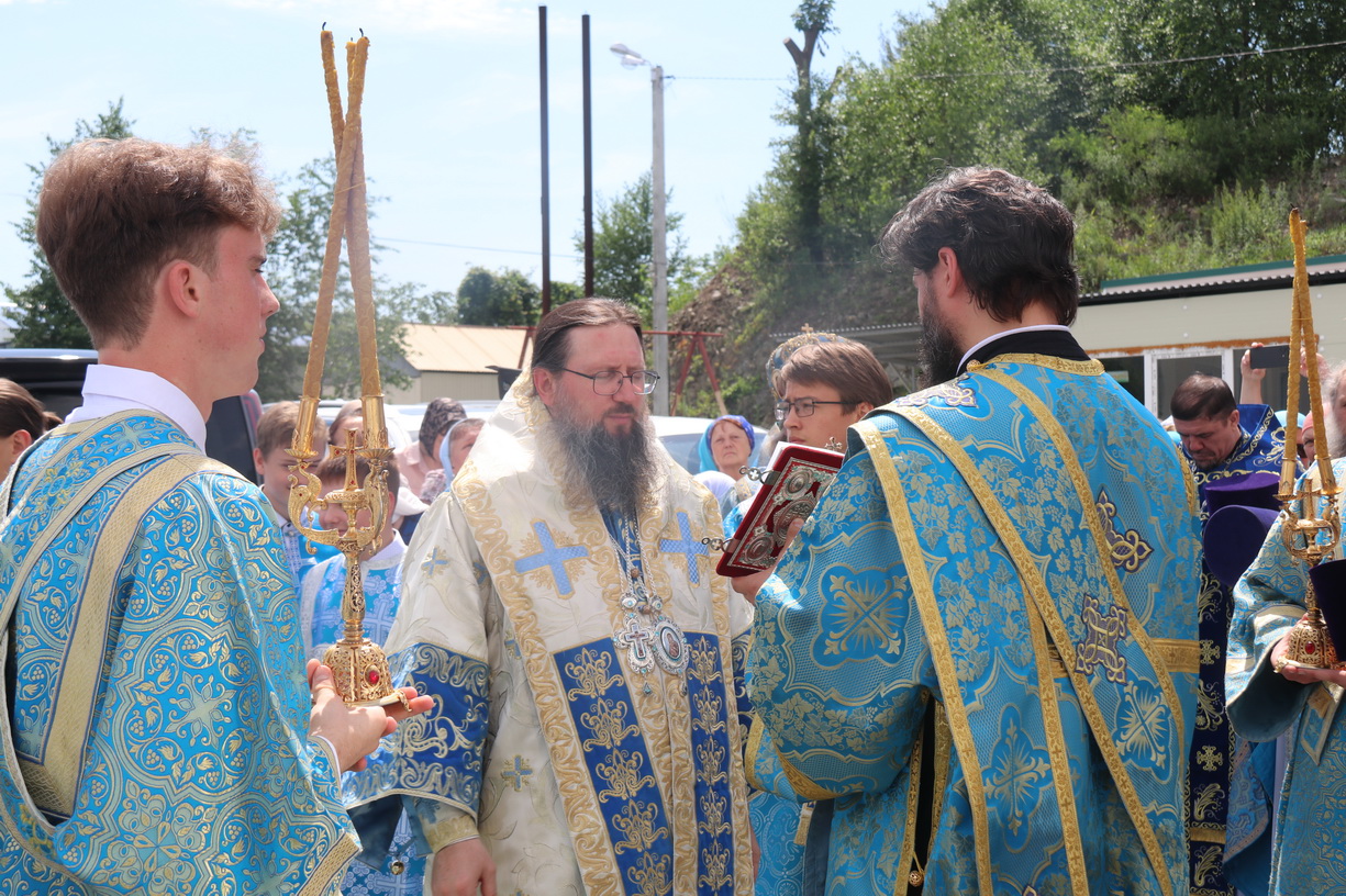 Литургия совершалась перед иконой «Собор святых покровителей воинства российского», прибывшей в храм накануне Крестным ходом из Арсеньевской епархии.