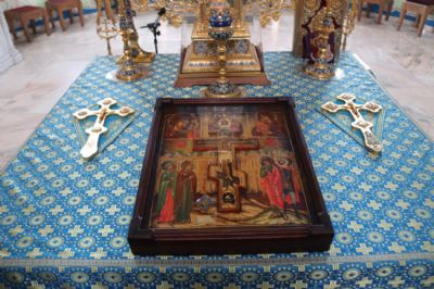 После великого славословия епископ Николай совершил вынос из алтаря храма иконы с частицей Честного Креста Господня.