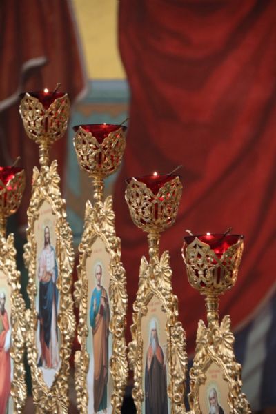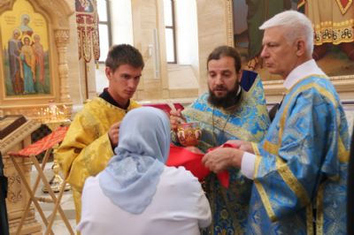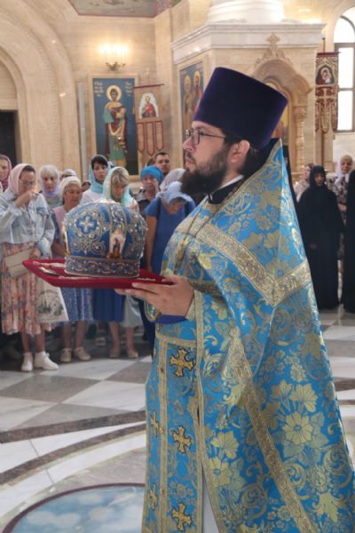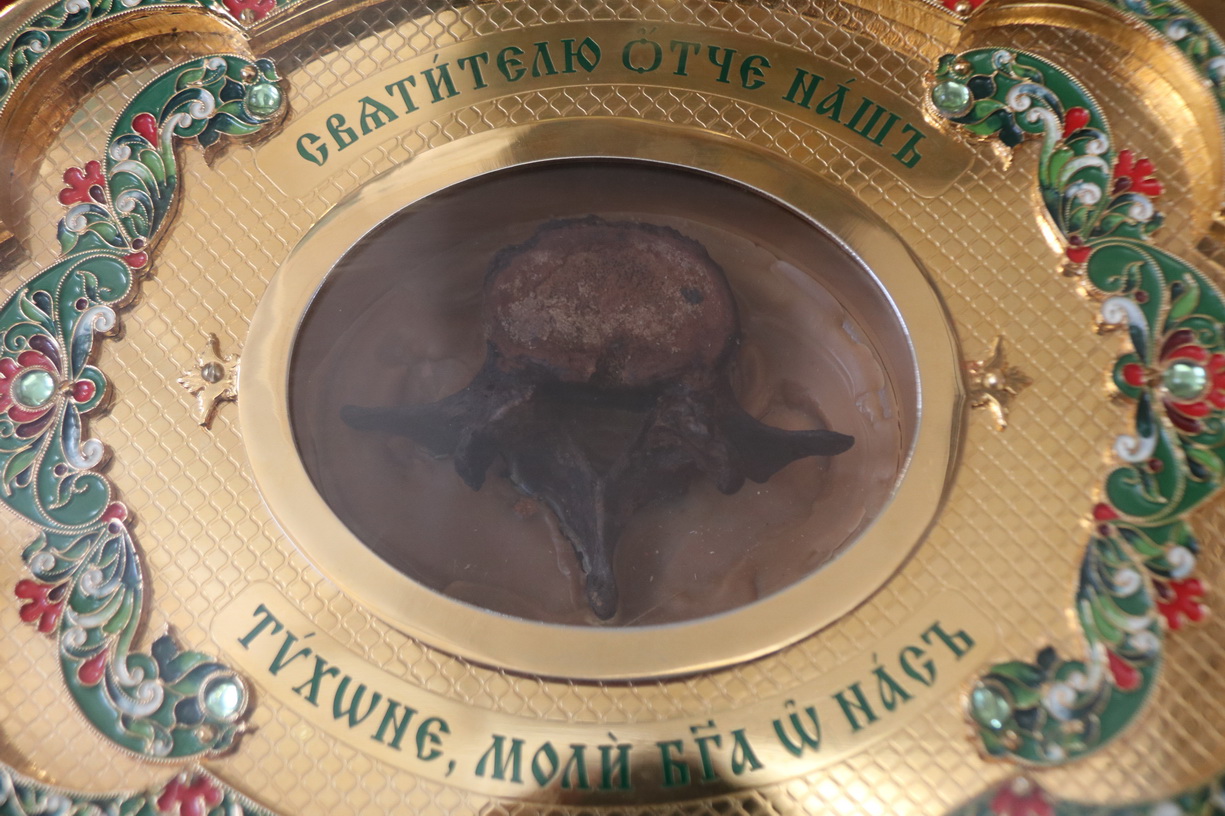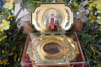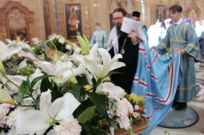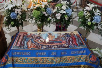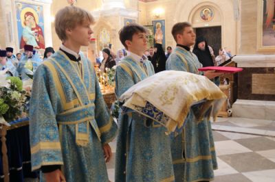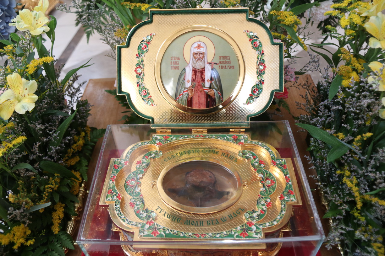 Литургия совершалась перед ковчегом с мощами святителя Тихона, Патриарха Всероссийского, который в эти дни пребывает в Спасо-Преображенском кафедральном соборе. В храме молились паломники из храмов митрополии, прибывшие поклониться святыне.