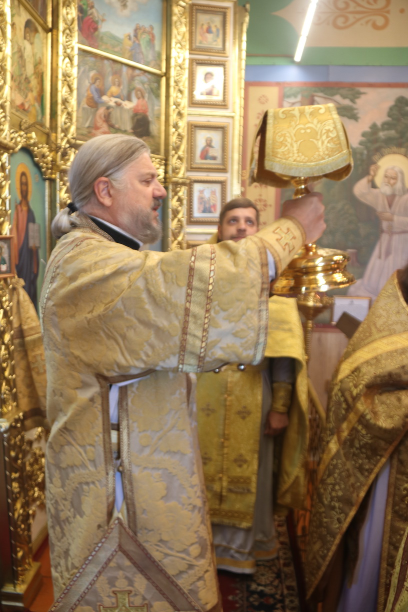 По заамвонной молитве епископ Николай возглавил праздничный моебен и славление святым, после чего обратился к прихожанам храма с архиерейским словом, в котором напомнил житие и апостольские труды святого Иоанна Богослова и святейшего Патриарха Тихона.