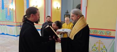 За вечерним богослужением, Владыка совершил постриг во чтеца, Михаила Красильникова, алтарника храма Рождества Христова г. Находки.