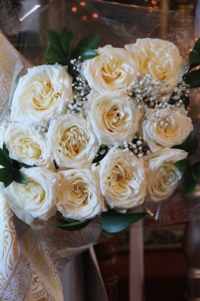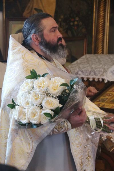 Также Владыка поздравил митрофорного протоиерея Василия Кабанова, настоятеля храма, с днем памяти его небесного покровителя святителя Василия Великого, архиепископа Кессарии Капподокийской и днем его 92-летия и преподнес ему букет белых роз.