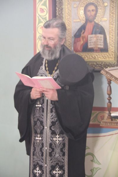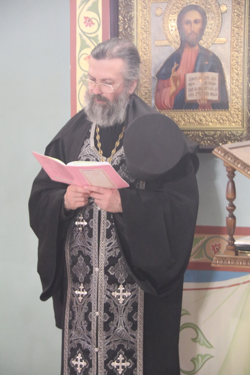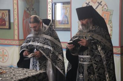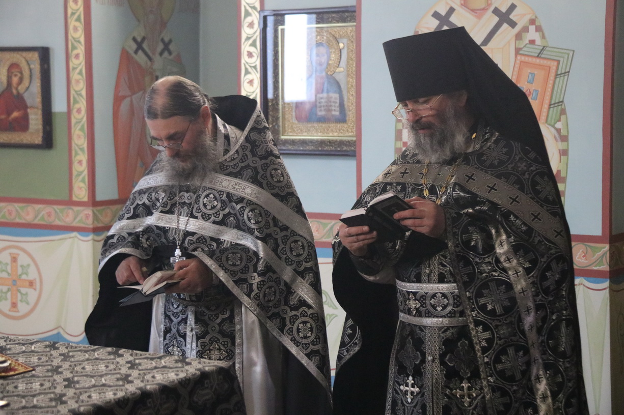 Его преосвященству сослужи: иерей Виталий Шаркеев; игумен Варнава (Литвин), настоятель храма Воскресения Христова с. Бровничи, иерей Сергий Вовк, клирик храма Рождества Божией Матери г. Паритизанска.