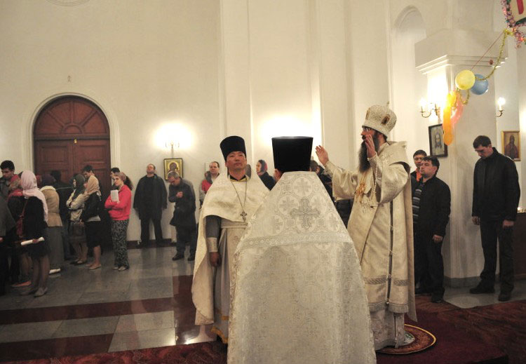 Владыка Иннокентий и сопровождавшие его члены делегации, вместе с корейскими священнослужителями о. Феодором Ким и о. Иоанном Ра, совершили в эти Пасхальные дни следующие праздничные богослужения: 14 апреля – Литургия Великой Субботы; 15 апреля – Пасхальная Литургия; 16 апреля – Литургия в Светлый понедельник. Эти службы прошли в Свято-Троицком храме г. Пхеньяна. Кроме этого, 18 апреля в молитвенной комнате при Посольстве Российской Федерации в КНДР была совершена Пасхальная утреня.
