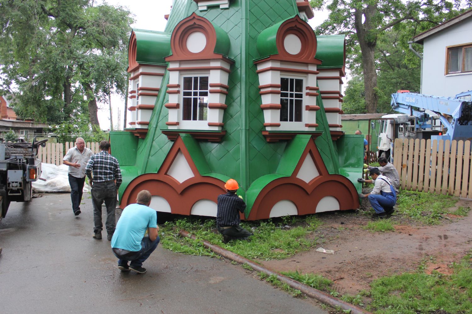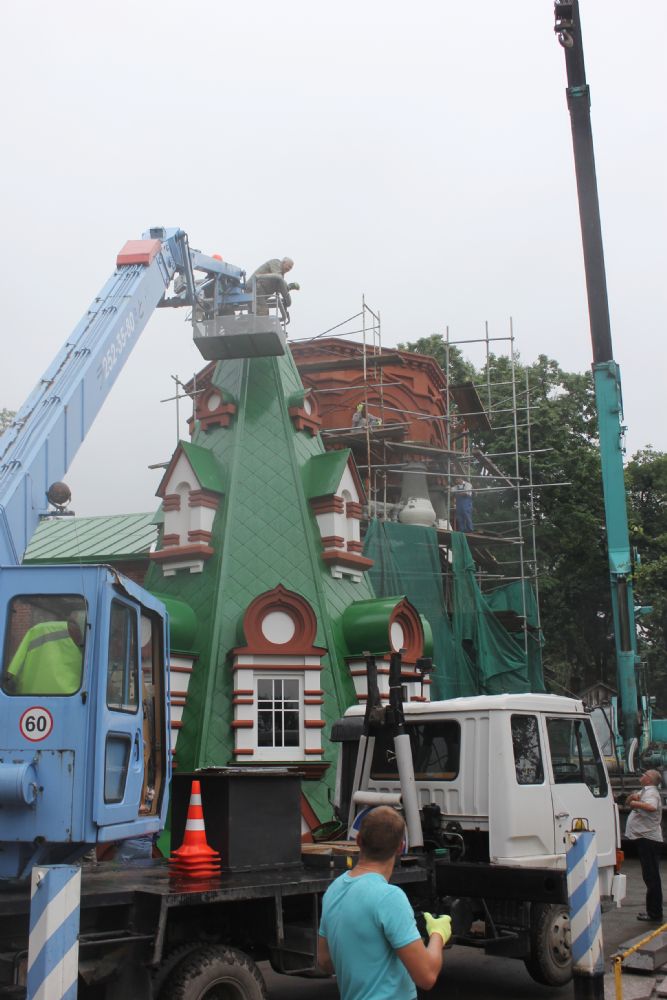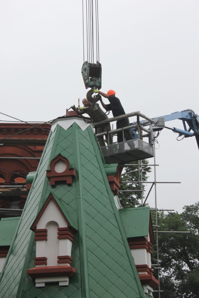 В среду, 31 июля 2013 года на колоннаду была установлена следующая часть колокольни – конусовидная шатровая конструкция. Работы производились с применением двух подъемных кранов, силами подрядчика - ООО «Дальстройбизнес II».