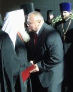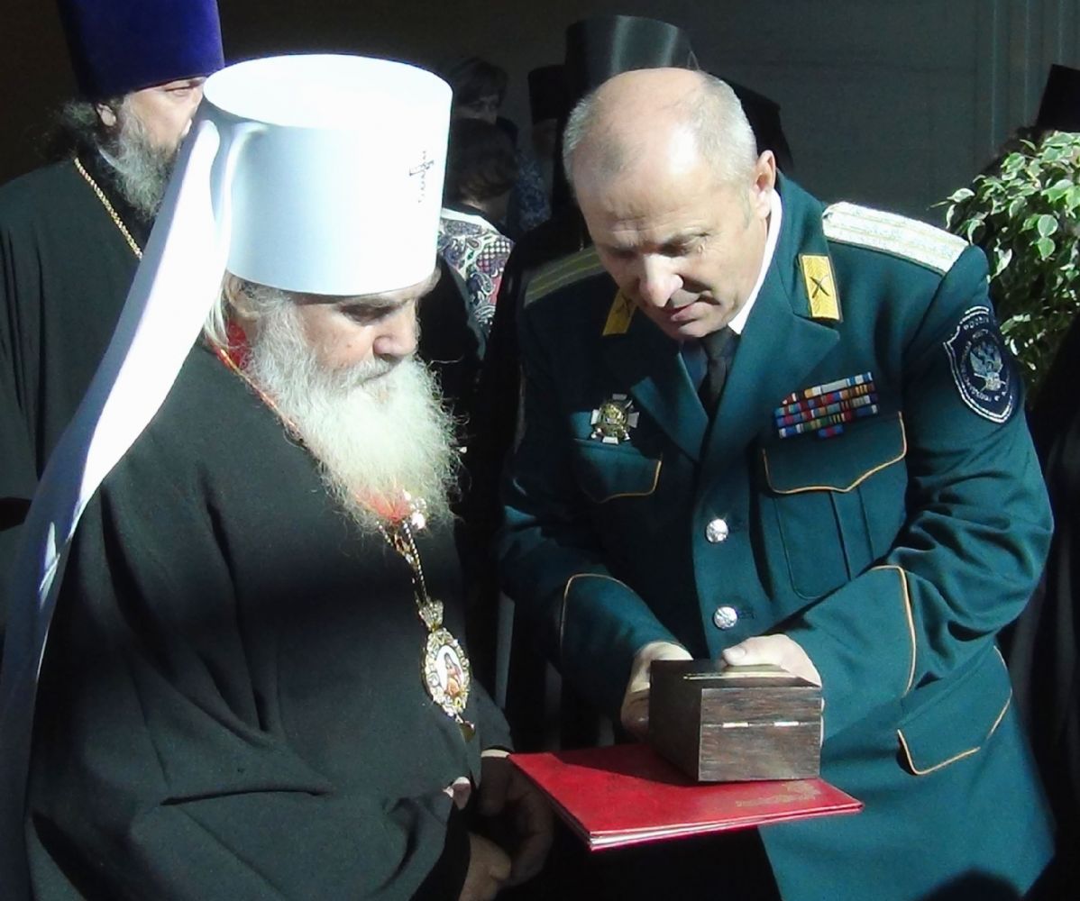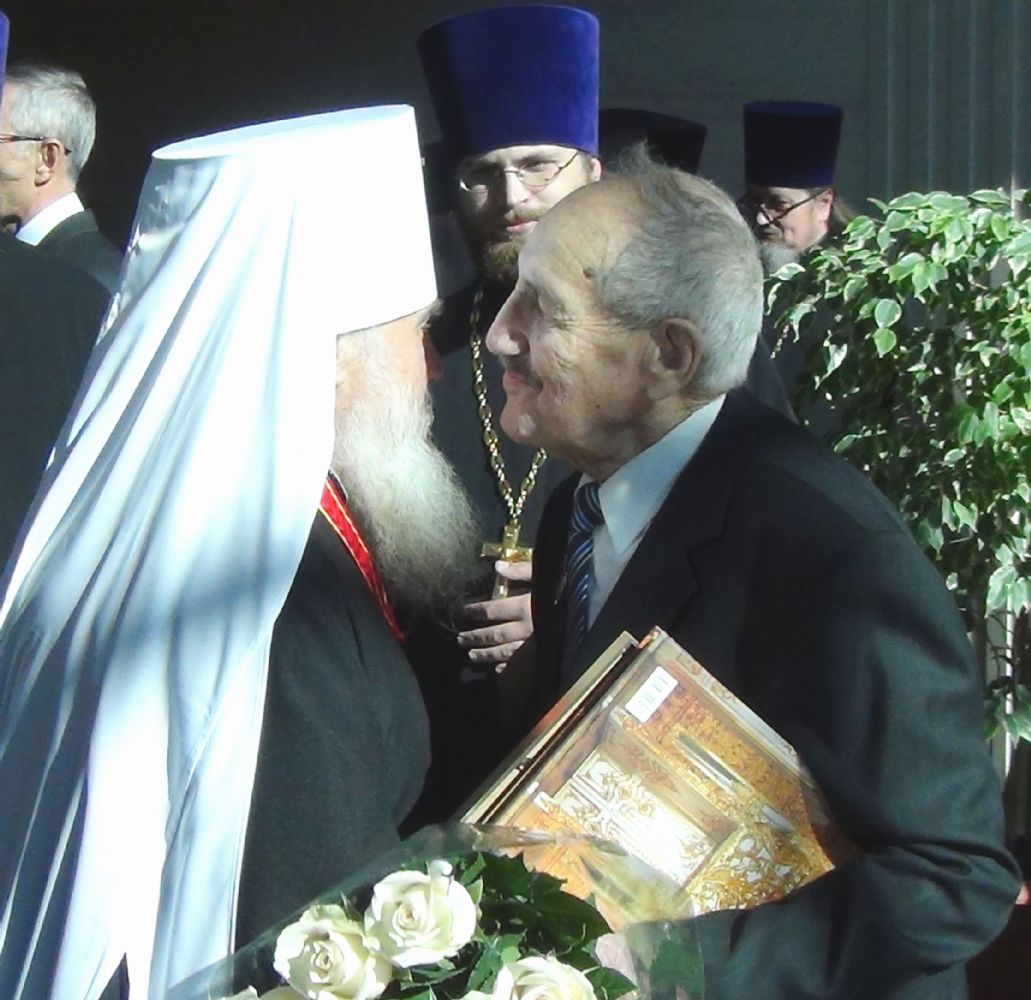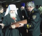 За праздничной Литургией в Покровском кафедральном соборе Высокопреосвященнейшего владыку поздравил Игорь Пушкарев. Глава Владивостока вручил Его Высокопреосвященству медаль «За вклад в развитие города Владивостока», а также преподнес позолоченный ковчег для хранения частиц святых мощей и подарочное издание сочинения Н.М.Карамзина «История государства Российского». Поздравление состоялось в алтарной части собора.