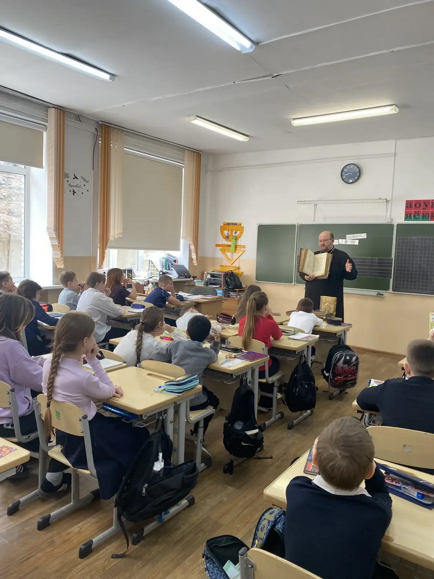 Иерей Роман Капитанюк провел увлекательную беседу с учениками четвертых классов средней общеобразовательной школы № 11 г. Находки. Темой обсуждения стали первопечатники и первые книги.