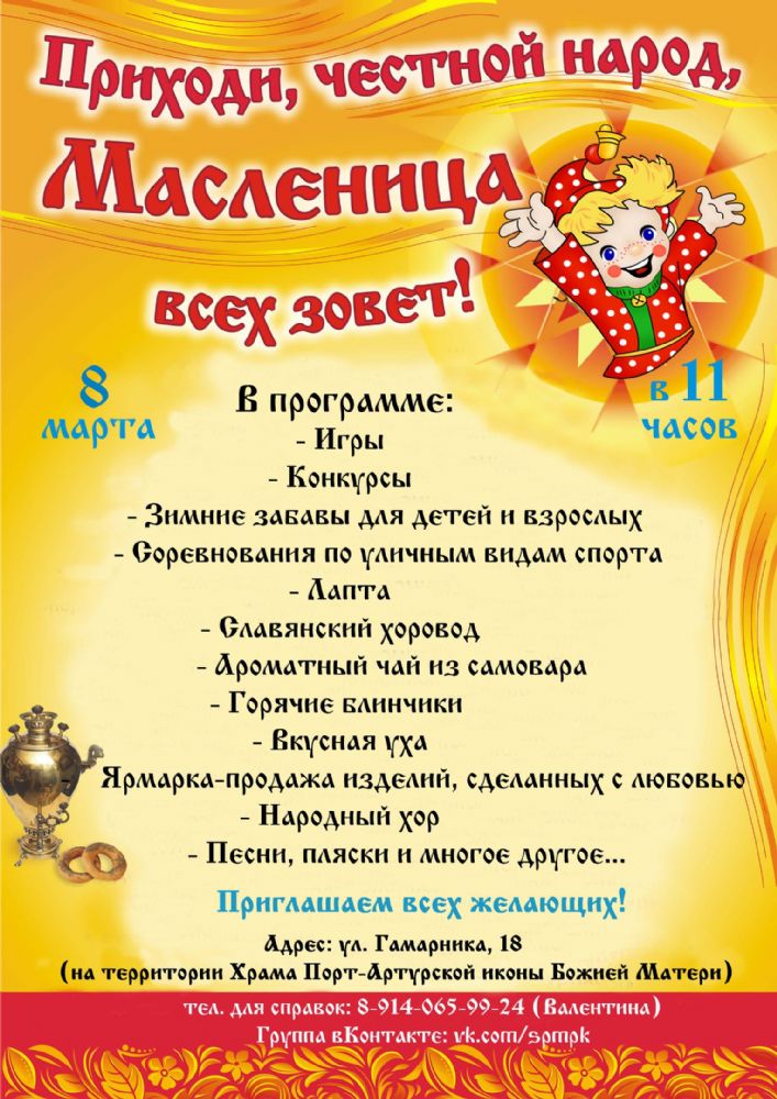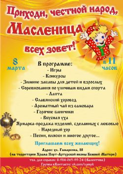 Широкая масленица, представление на территории у храма (в программе: конкурсы, народные танцы, хороводы, блины и многое другое)
