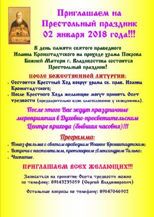 2 января, в день памяти святого праведного Иоанна Кронштадсткого престольный праздник прихода Покровского кафедрального собора.После Божественной литургии состоится крестный ход вокруг храма в честь святого праведного Иоанна Кронштадсткого ипраздничные мероприятия.