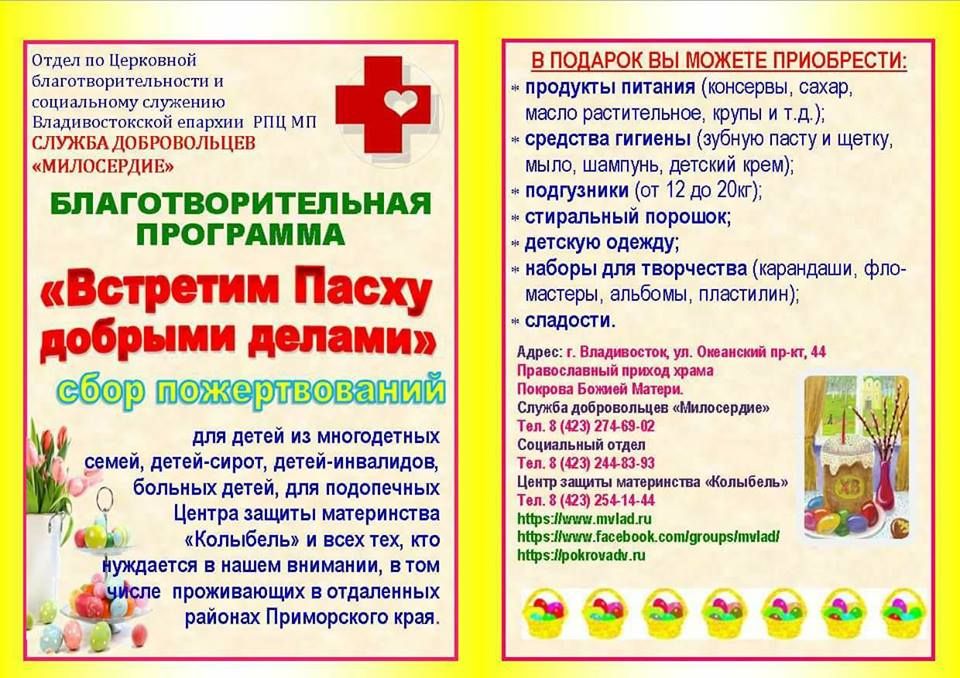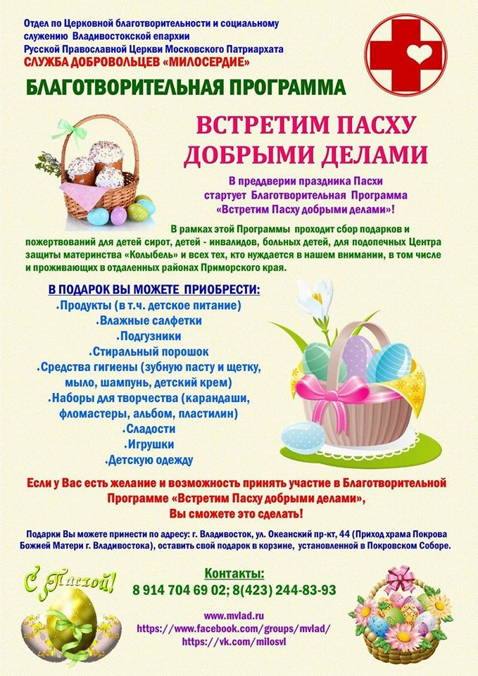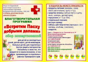 Благотворительная программа «Встретим Пасху добрыми делами» впервые проводилась службой «Милосердие» в 2012 году и с тех пор стала ежегодной традицией.