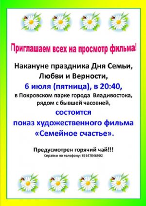 Накануне праздника состоится показ художественного фильма "Семейное счастье" и чаепитие.