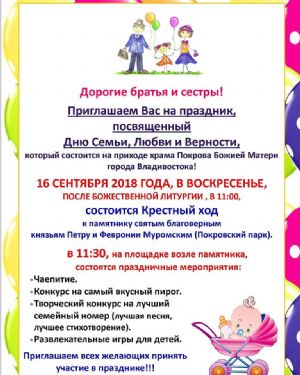 16 сентября 2018 года в день памяти святых Петра и Февронии по окончании Божественной Литургии в Покровском кафедральном соборе состоится Крестный ход к памятнику святым благоверным князьям Петру и Февронии. По окончании – чаепитие, конкурс на самый вкусный пирог, творческий семейный конкурс, развлечения и игры для детей.