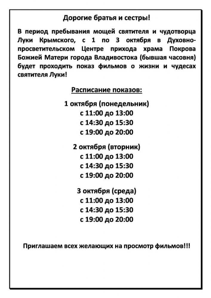 1-3 октября 2018 года в Просветительском центре Покровского кафедрального собора организован показ документальных фильмов о святителе Луке Крымском.