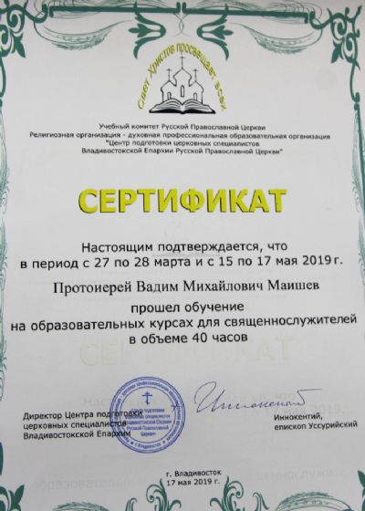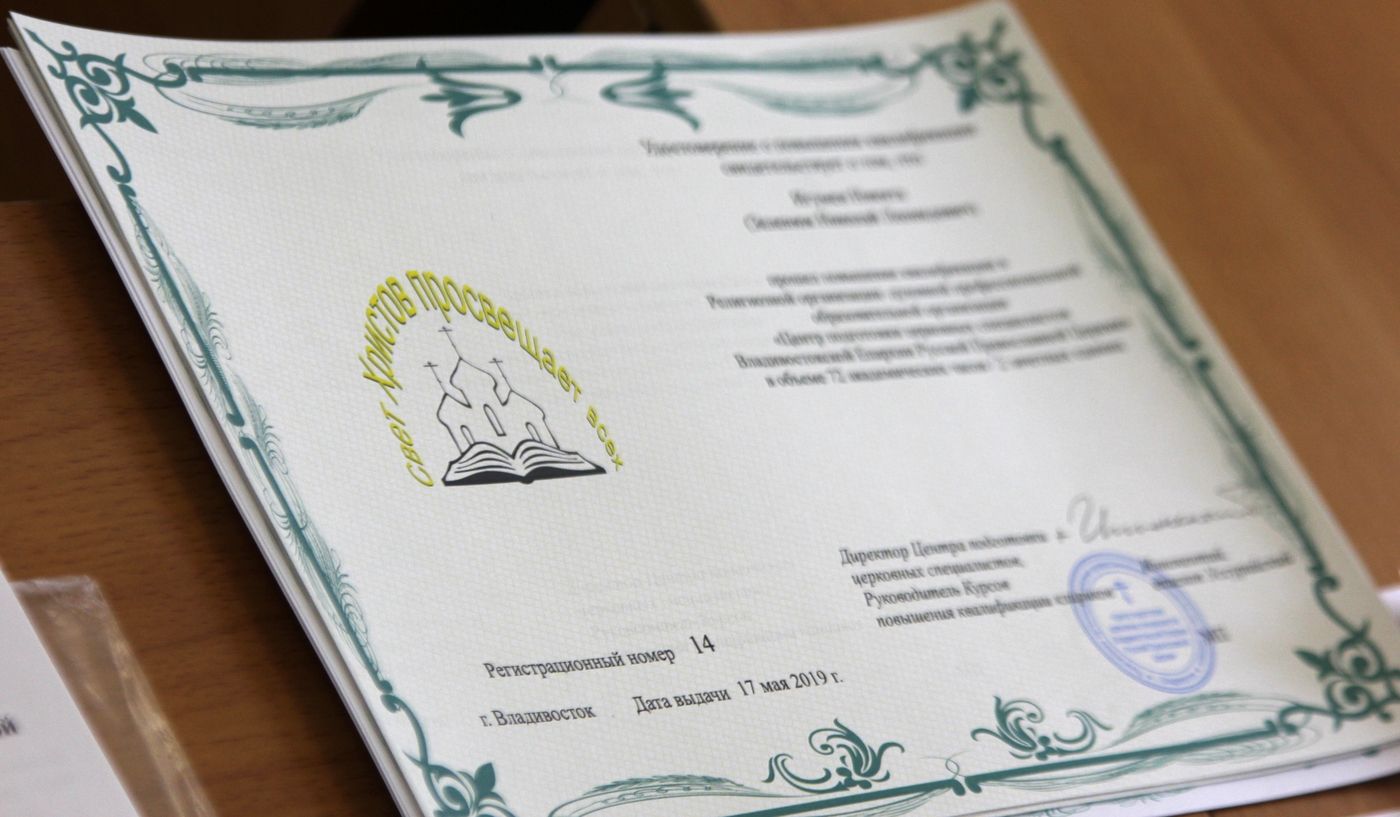 1-е курсы повышения квалификации священнослужителей прошли во Владивостокской епархии в октябре-ноябре 2018 г., по их результатам 13 священников получили удостоверения о повышения квалификации. Таким образом на сегодняшний день в епархиях Приморской митрополии 21 священник имеют статус повысивших уровень подготовки к пастырской деятельности. Напомним, все священнослужители, имеющие семинарское образование, по решению Священного Синода призваны через 5 лет по завершении духовного учебного заведения повышать квалификацию.