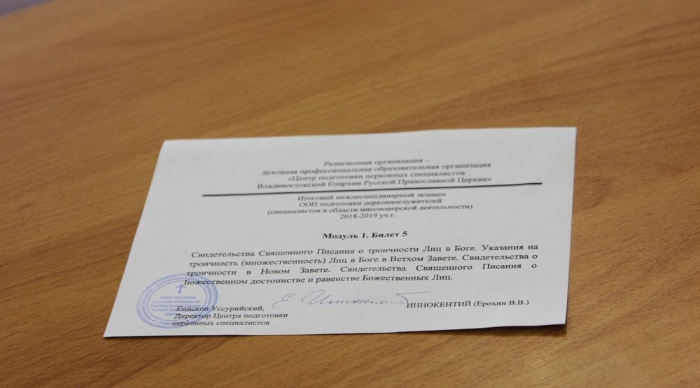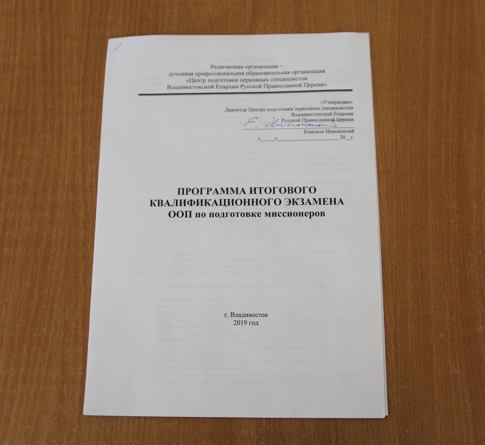 10 июня 2019 г. аттестационная комиссия приняла выпускные междисциплинарные экзамены у студентов заочной и очно-заочной форм обучения по программе подготовки специалистов в области миссионерской деятельности. Работу комиссии возглавил директор Духовного центра епископ Уссурийский Иннокентий. Вместе с ним студентов аттестовывали преподаватели центра игумен Антоний (Каменчук), иеромонах Марк (Корнилов), чтец Дерягин Н. М., преподаватель кафедры теологии ДВФУ иерей Дионисий Гордеев, ученый секретарь Солоненко Л. В.