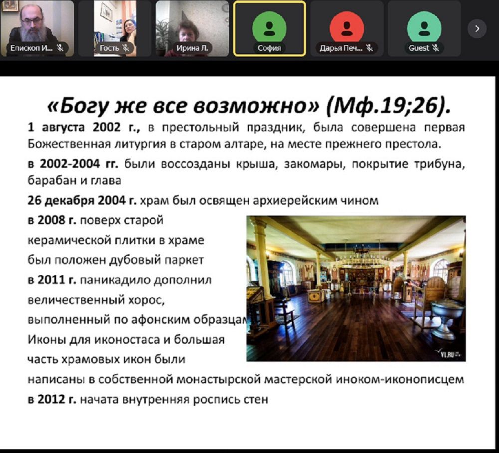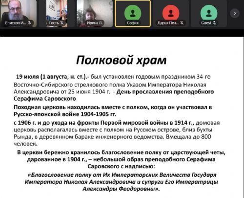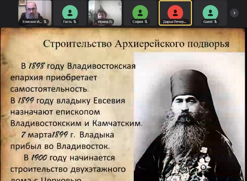 6 марта 2024 года прошло 2-е заседание студенческого круглого стола, приуроченного к 125-летию образования Владивостокской епархии. В этот раз темой обсуждения стали «Православные монастыри Приморского края». С приветственным словом к его участникам обратился директор Центра епископ Уссурийский Иннокентий. Заседание прошло в дистанционном формате.