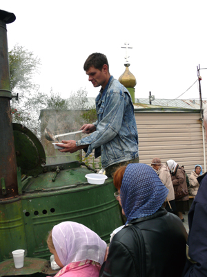 После богослужения на дворе храма состоялась трапеза. Приход св. правед. Иоанна Кронштадтского накормил собравшихся на праздничную службу гречневой кашей из полевой кухни.