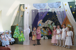 Участниками костюмированного представления стали малыши младшей, средней и старшей групп. Основой сценария спектакля послужила сказка Л. Чарской «Снегурочка-царевна», по традиции переложенная на стихи Евгенией Коваленко, мамой одного из воспитанников воскресной школы.