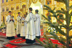 «Сегодня наша планета встречает величайшее из событий человеческой истории — Боговочеловечение, вхождение в нашу грешную жизнь Бога Любви и Добра, ставшего Человеком, чтобы нас, земных, сделать небесными, чтобы через очищение и преображение человеческой души сделать ее подобной Богу для вечной с Ним жизни. Снова и снова поздравляю всех вас с великим и радостным для верующего сердца праздником Рождества Христова и Новолетием!» — сказал, в частности, владыка.
