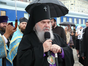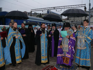 На перроне железнодорожного вокзала архиепископ Владивостокский и Приморский Вениамин в сослужении духовенства епархии совершил молебен, после чего