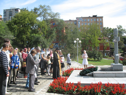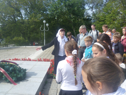 На месте захоронения генерал-губернатора к детям из воскресной школы присоединились участники молодежного и социального движения в честь иконы Божией Матери «Объятия Отча» при Успенском храме и отец Даниил совершил заупокойную литию.