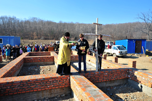 Там по случаю чествования Казанской иконы Божией Матери и празднования Дня народного единства была осуществлена закладка камня и закладной грамоты в основание храма, а под открытым небом был совершен праздничный молебен. Возглавил богослужение секретарь Владивостокской епархии, председатель попечительского совета гимназии и ее духовник протоиерей Игорь Талько.