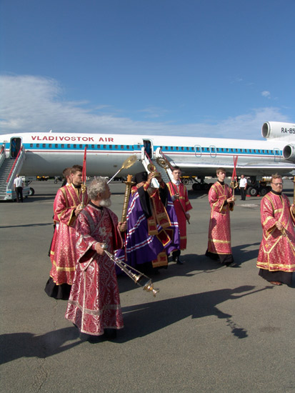 Торжественная встреча святыни началась прямо у борта самолета в аэропорту, где архиепископ Владивостокский и Приморский Вениамин с большой группой духовенства и монашествующих совершил молебен святому великомученику Георгию Победоносцу. Затем рота почетного караула Тихоокеанского флота прошла торжественным маршем, отдав почести в честь великого христианского воина-победителя, чье имя вписано в славную историю русской армии и флота. После этого архиепископ Вениамин провел на летном поле небольшую пресс-конференцию. Он рассказал о жизни великомученика Георгия Победоносца и истории почитания его святости. Архиепископ Вениамин назвал принесение частицы мощей на дальневосточную землю знаменательным событием: «Нужно подобно Георгию Победоносцу мужественно выступить на борьбу со злом, проснуться от духовной спячки и погружения в материализм и вещицизм. Без святыни в сердце трудно жить. Подлинная жизнь – это жизнь с верой в Бога, с надеждой на Него, с любовью к родине», - сказал он.