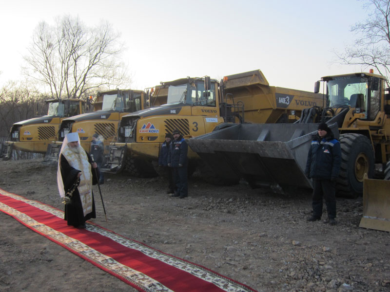 Также Высокопреосвященнейший владыка митрополит Вениамин совершил освящение техники, применяемой на предприятии – больших экскаваторов, бульдозеров, самосвалов.