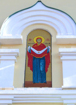 Мозаичный образ Божией Матери установлен над входом в Покровский кафедральный собор