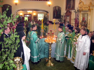 Накануне, вечером 11 июня, здесь же прошло всенощное бдение при том же соборном служении. В своей проповеди после литургии владыка обратил внимание на то, что соборное служение в период Пятидесятницы - это зримые черты действия Господа Духа Святого, соединяющего, собирающего всех в единой вере. Так благодать, поданная апостолам, видимо призывает в Церковь Христову, в ее спасительную ограду.