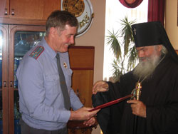 По благословение Святейшего Патриарха Московского и Всея Руси Алексия II архиепископ Владивостокский и Приморский Вениамин вручил награды Оборину Юрию Владимировичу и командиру полка ДПС ГИБДД города Владивостока полковнику милиции Старинец Николаю Николаевичу.