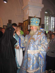 Под пение тропаря и величания мощи святителя были перенесены крестным ходом от святых врат монастыря в храм, где архиепископ Вениамин в сослужении с собором духовенства совершил молебен и всенощное бдение с чтением акафиста Рождеству Пресвятой Богородицы. В этот праздничный день владыка совершил помазание богомольцев особым миром от мощей святителя Николая, привезенным им из г. Бари (Италия). Паломники имели возможность поклониться и приложиться к принесенной святыне.