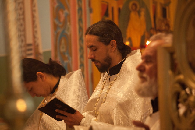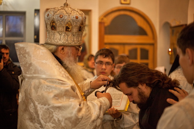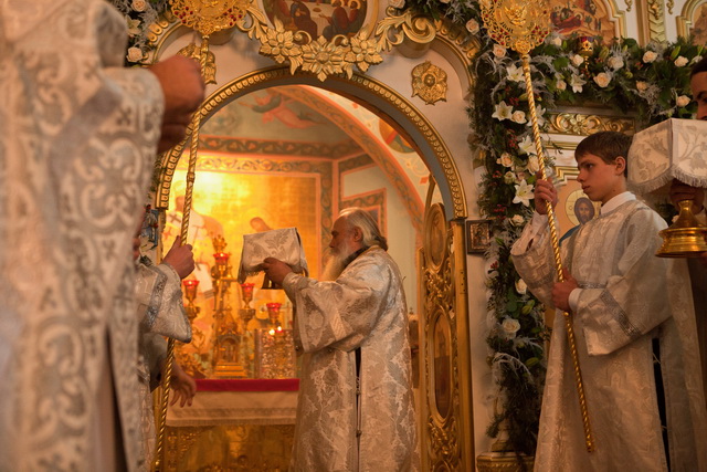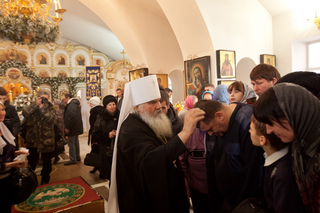 Его Высокопреосвященству сослужили: настоятель храма иерей Олег Дикмаров и клирики Успенского прихода. За богослужением митрополит Вениамин совершил хиротонию, рукоположив во диакона раба Божия Бориса, для служения направленного в Свято-Никольский кафедральный собор.