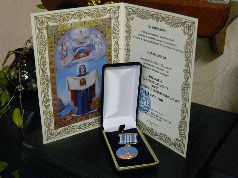 Медалей «За церковные заслуги перед Владивостокской и Приморской епархией» III степени удостоены: руководитель Епархиальной библиотеки монахиня Есфирь (Малюка); ученый секретарь Владивостокского Духовного училища Людмила Владимировна Солоненко.