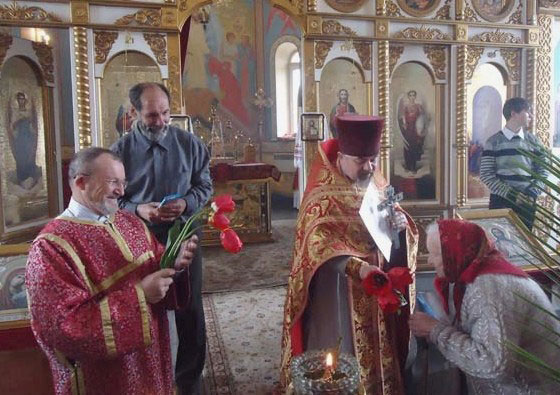 По окончании богослужения о. Владимир поздравил прихожан с 67-й годовщиной Победы в Великой Отечественной войне и вручил ветеранам и трём труженицам тыла цветы, благодарственные письма, шоколад и иконки вмч. Георгия Победоносца.
