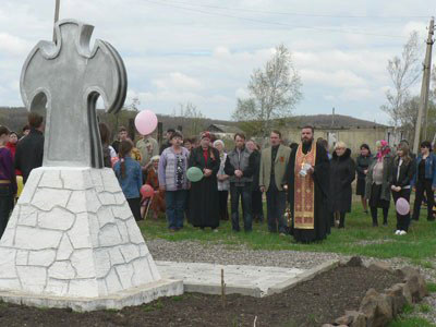 Затем священник и прихожане направились к мемориалу, установленному рядом с храмом в честь погибших воинов; на памятнике выгравирована надпись: «Солдат, умерший за народ, бессмертен». Протоиерей Владимир