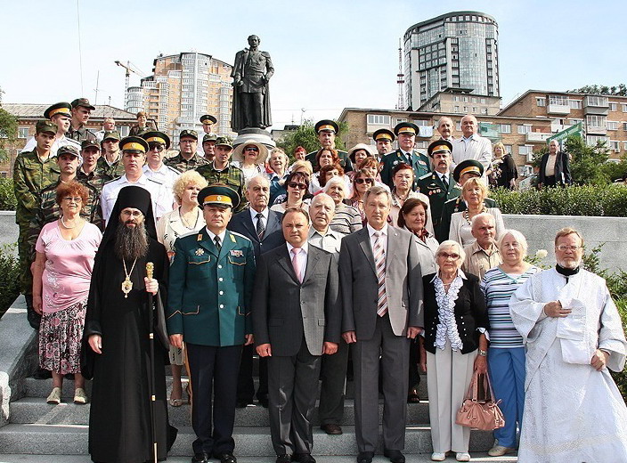 Справка. Открытие памятника генерал-губернатору Николаю Николаевичу Муравьеву-Амурскому состоялось во Владивостоке в День города, 2 июля 2012 года; торжественную церемонию возглавил Глава Правительства России Дмитрий Анатольевич Медведев, в ходе своей поездки по Дальнему Востоку. На церемонии присутствовал Глава Приморской митрополии митрополит Владивостокский и Приморский Вениамин.