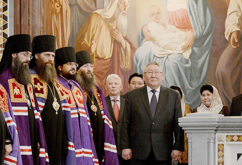 Затем Святейший Патриарх Кирилл обратился к собравшимся с Первосвятительским словом. В честь 380-летия вхождения Якутии в состав Российского государства и во внимание к вкладу в развитие сотрудничества с Якутской епархией Святейший Патриарх Кирилл наградил президента Республики Саха (Якутия) и Е.А. Борисова орденом «Славы и чести» II степени. Во внимание к многолетним трудам в деле становления Православия в Якутии, в связи с 380-летием вхождения Якутии в состав Российского государства, а также по случаю 75-летия со дня рождения Святейший Патриарх Кирилл вручил первому президенту Якутии, депутату Государственной Думы ФС РФ VI созыва М.Е. Николаеву орден «Славы и чести» II степени.