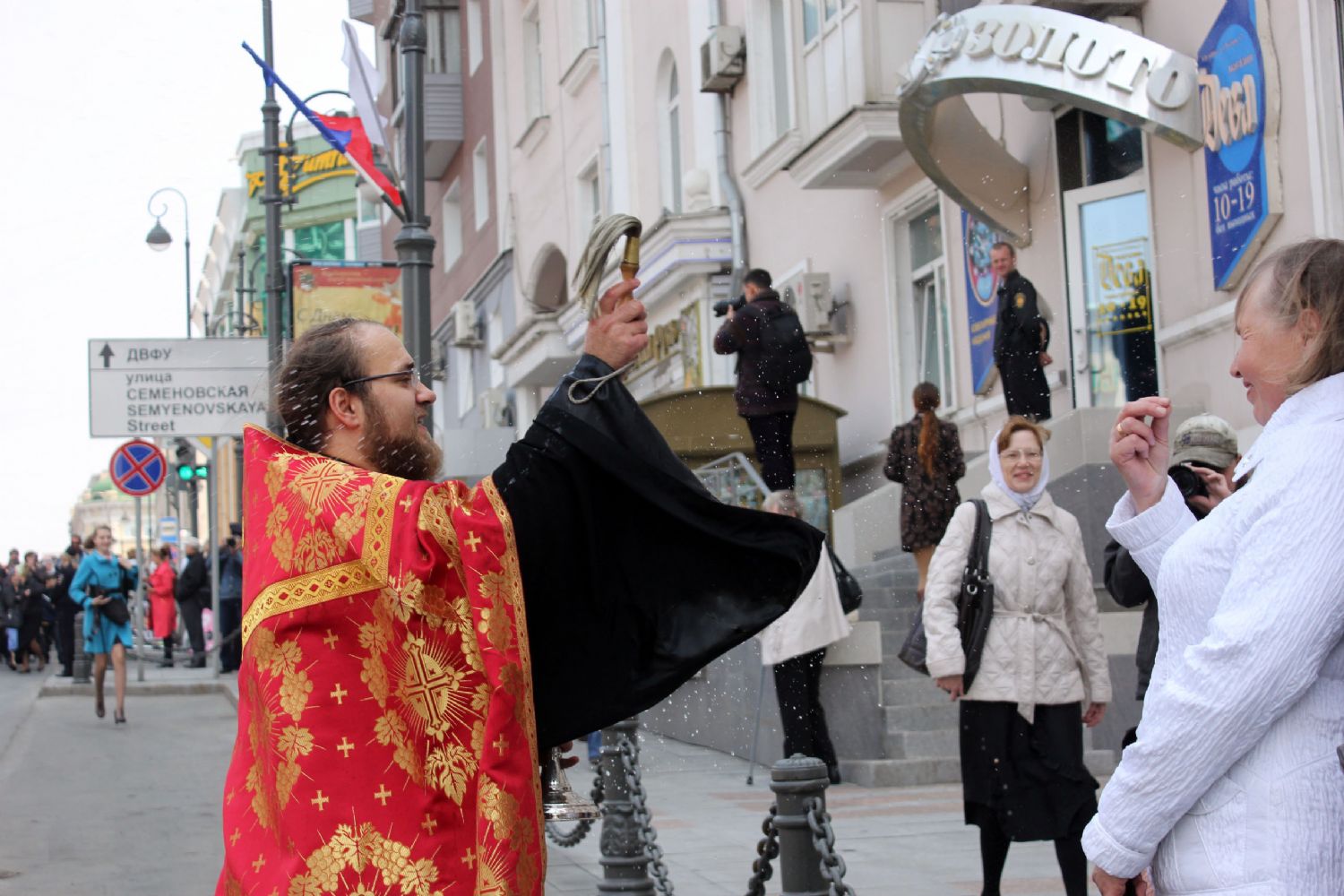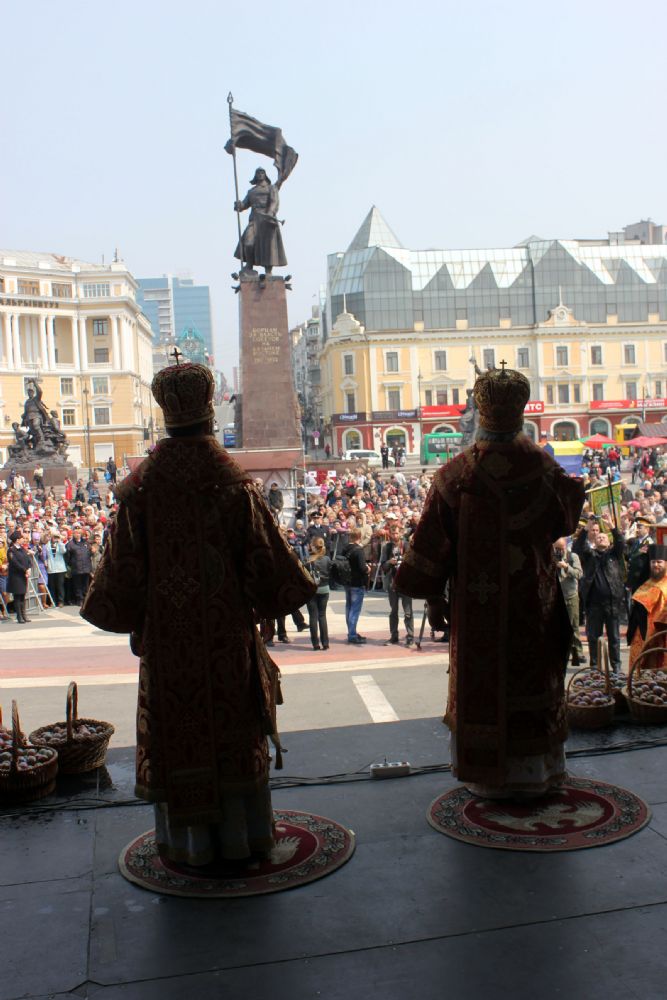 Духовенство и верующие прошли от Покровского кафедрального собора по Океанскому проспекту к центральной площади Владивостока, где был совершен Пасхальный молебен.