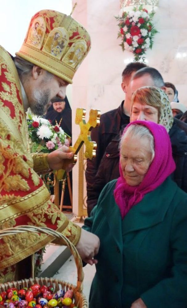 Владыка Вениамин по завершении Пасхальной заутрени похристосывался с прихожанами, раздал деревянное пасхальное яйцо.